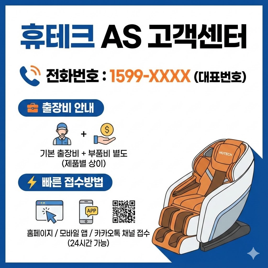 휴테크는 국내 안마의자 브랜드 중 A/S 시스템이 정말 잘 되어 있는 편입니다.